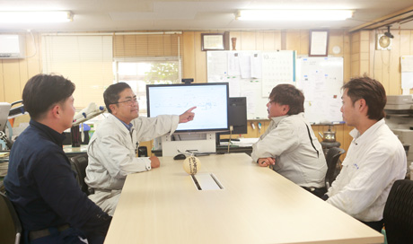 作業確認のミーティング後、気合を入れて仕事開始。いろいろな工具の使い方や作業の手順は、先輩がしっかり教えてくれるから心配ナシ。